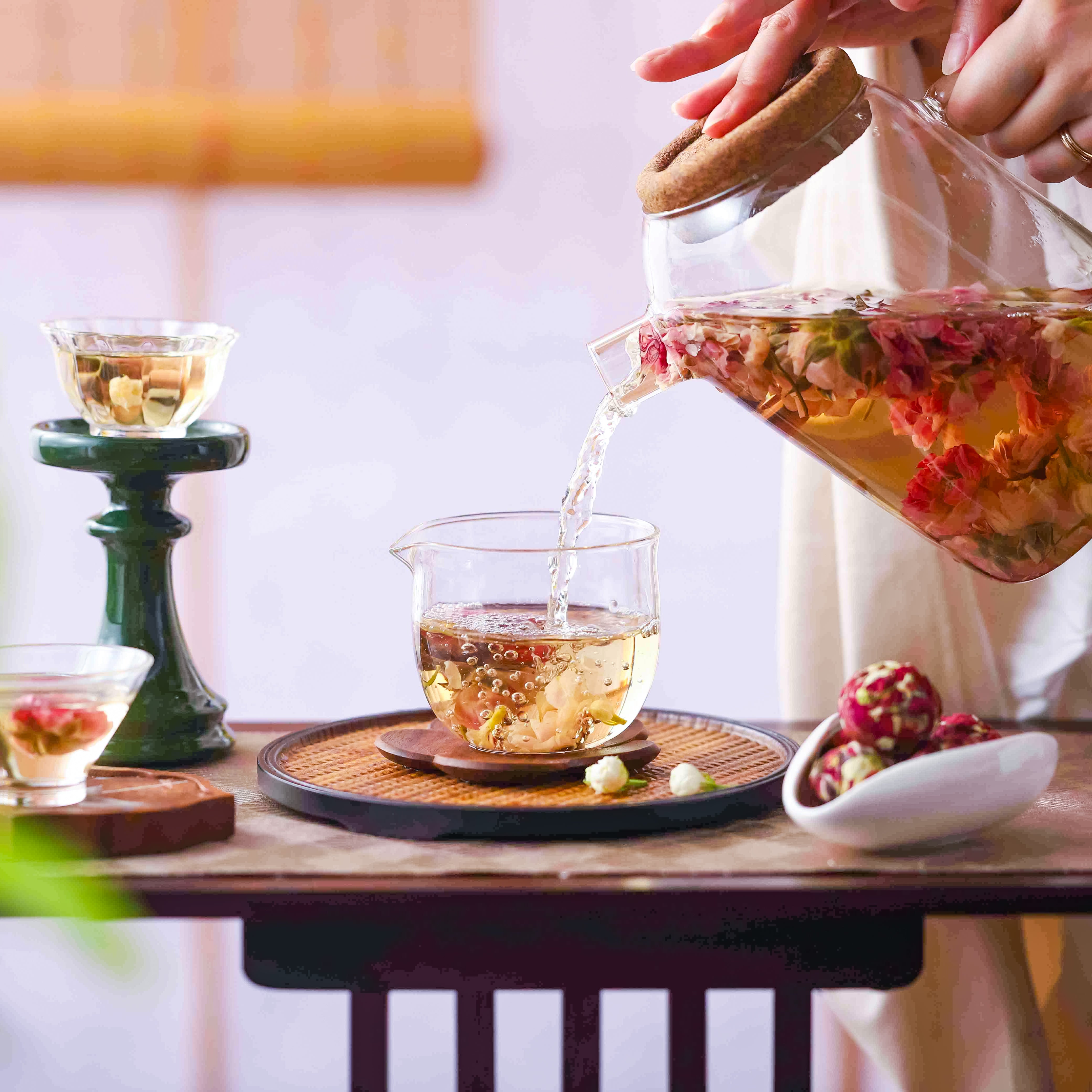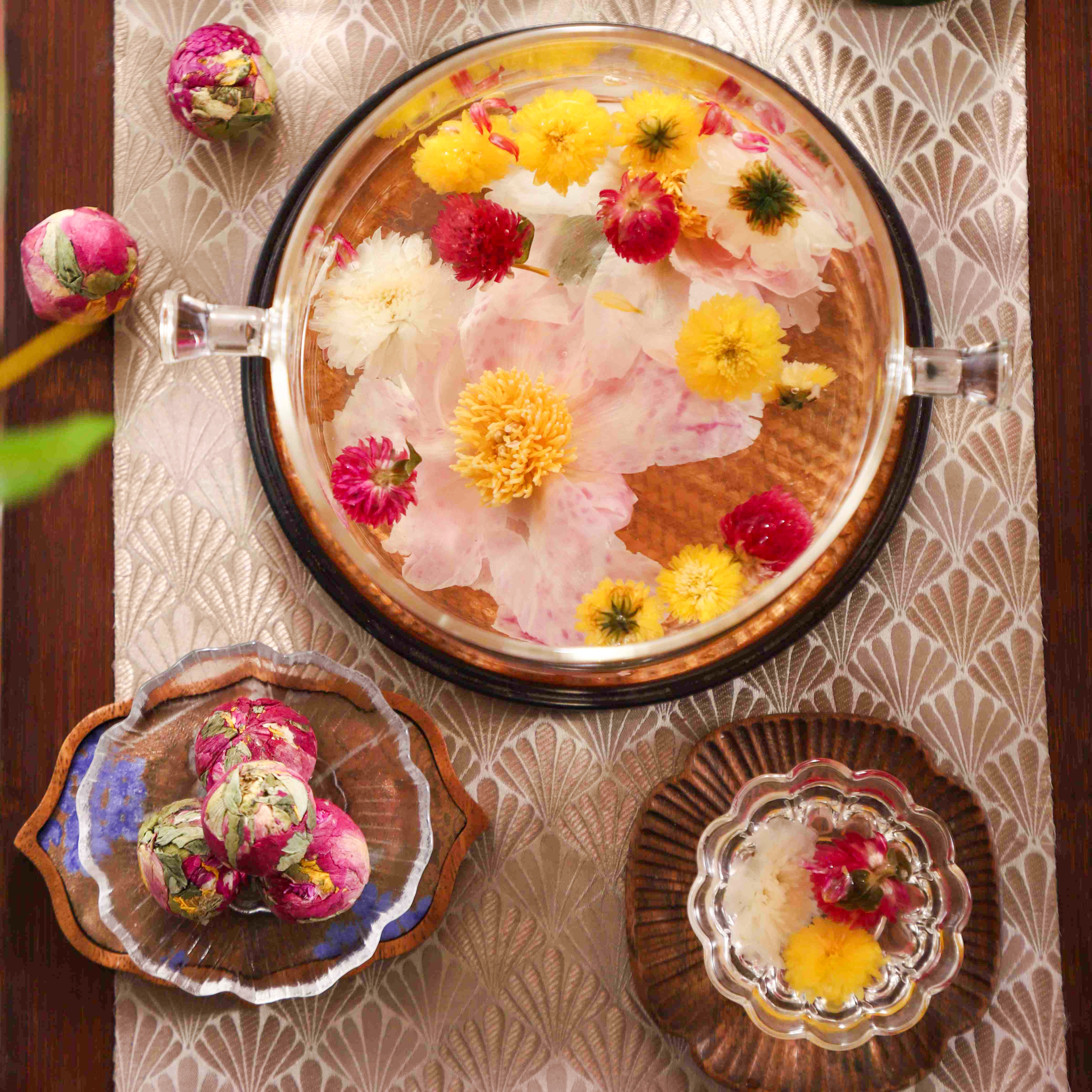 Peony Dreamscape (peonies with chrysanthemum and globe amaranth), Starry Sky Elixir (butterfly pea + rose)— eases stress and guides the body toward restful, deep sleep.