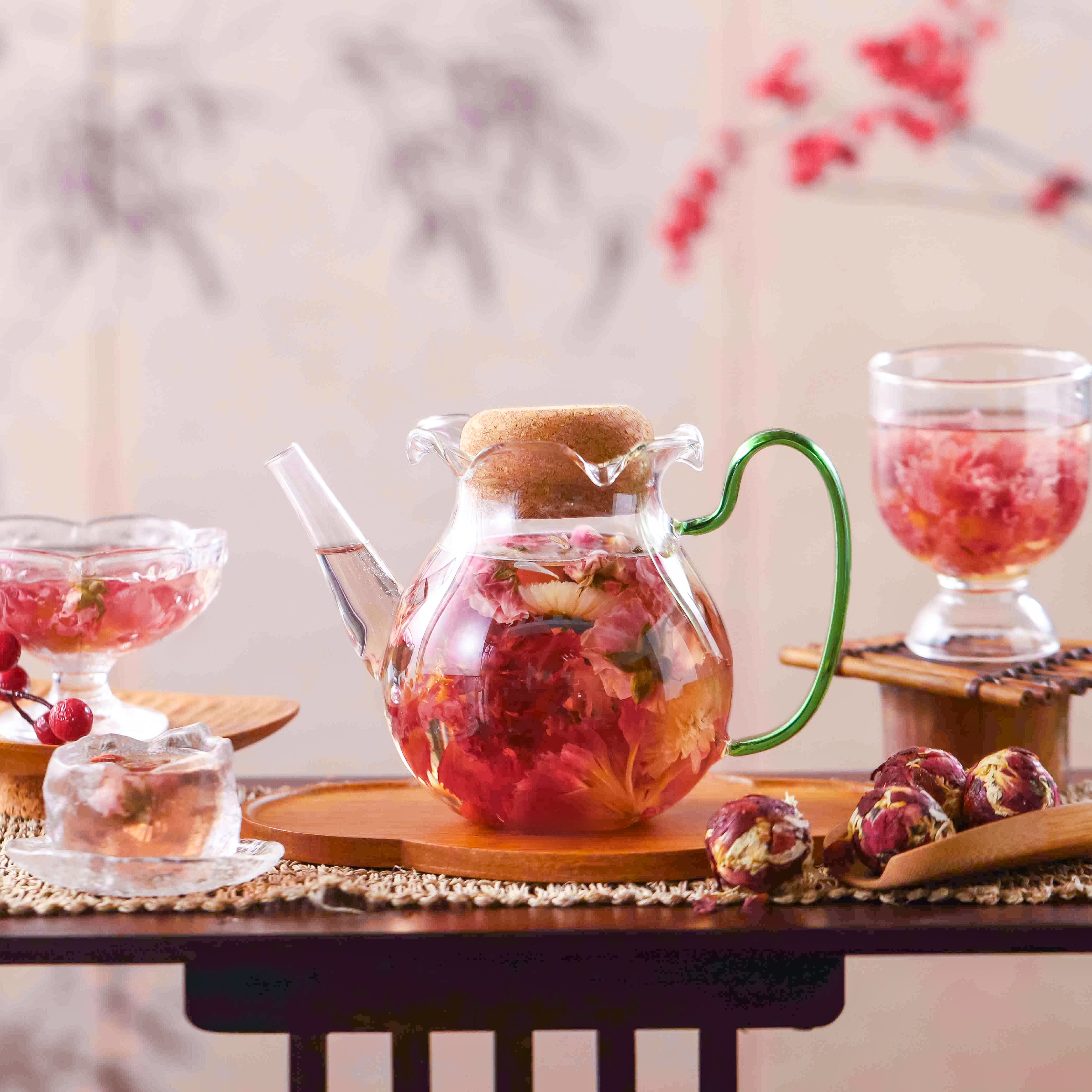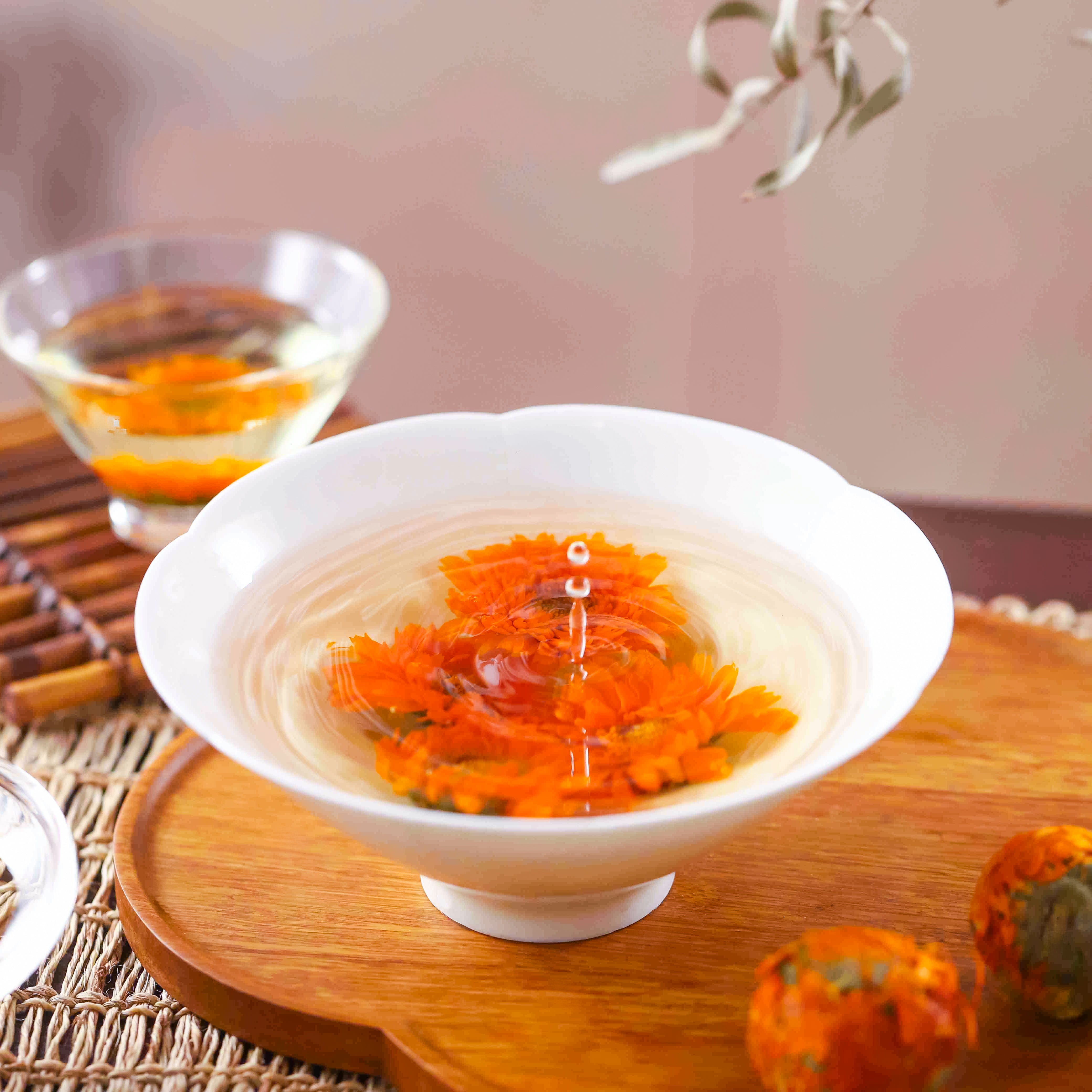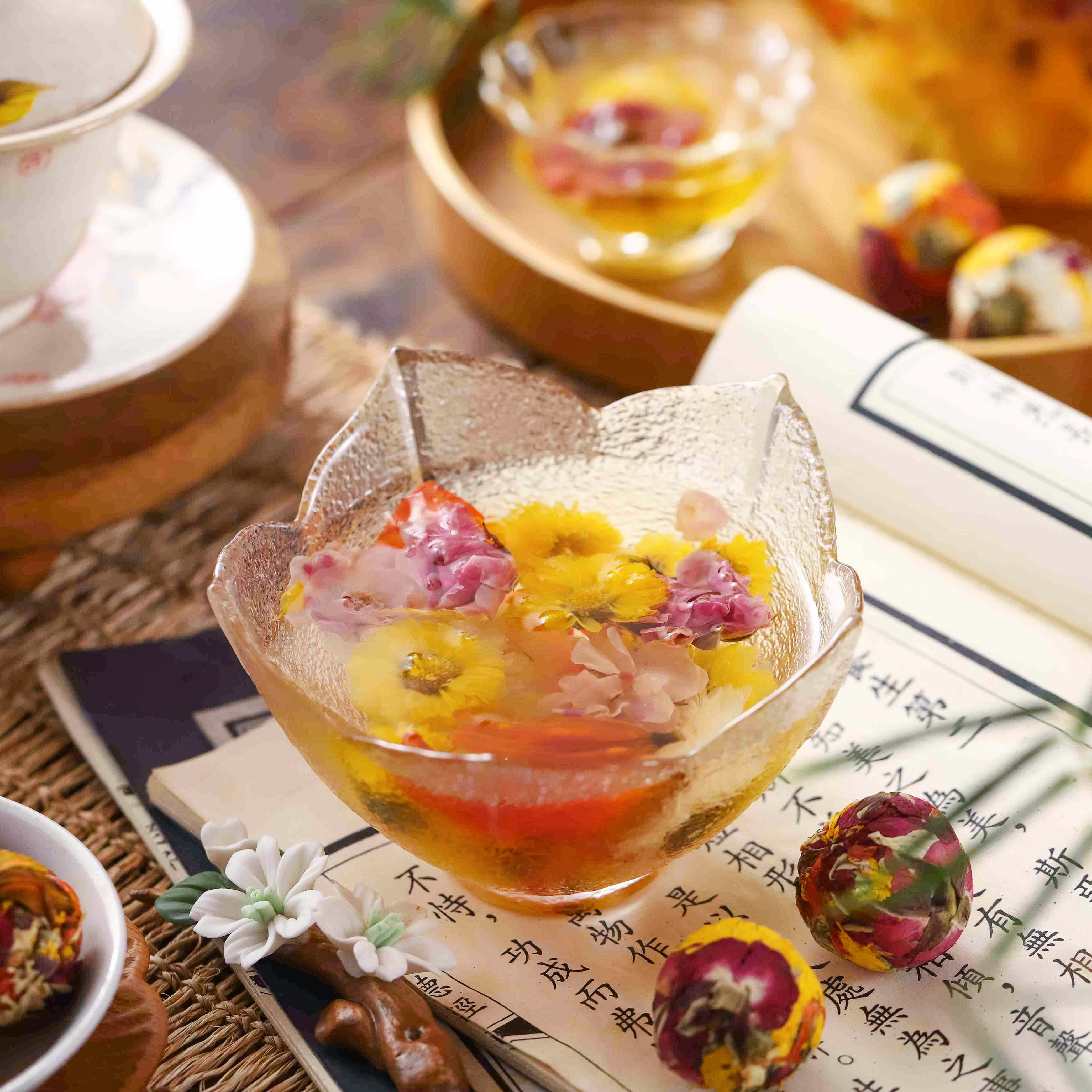 Golden Solstice (chrysanthemum, lily, rose) and Crimson Symphony (carnation, chrysanthemum, rose, goji)— sustains steady energy and focus for long afternoons.